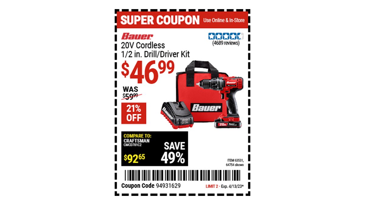 Harbor Freight on Twitter "Buy the BAUER 20V Lithium 1/2 In. Drill/Driver Kit (Item 64754) for Drill Driver Harbor Freight Coupon inside track club members can buy the drill master 1/4 in. save 40% off any single daytona brand jack. Compare our price of $29.99 to hart at $58 (model number: browse harbor freight tools coupons and promo codes for big savings on tools for your next project or adventure. warrior 18v cordless 3/8 in. Cordless drill/driver. Drill Driver Harbor Freight Coupon.